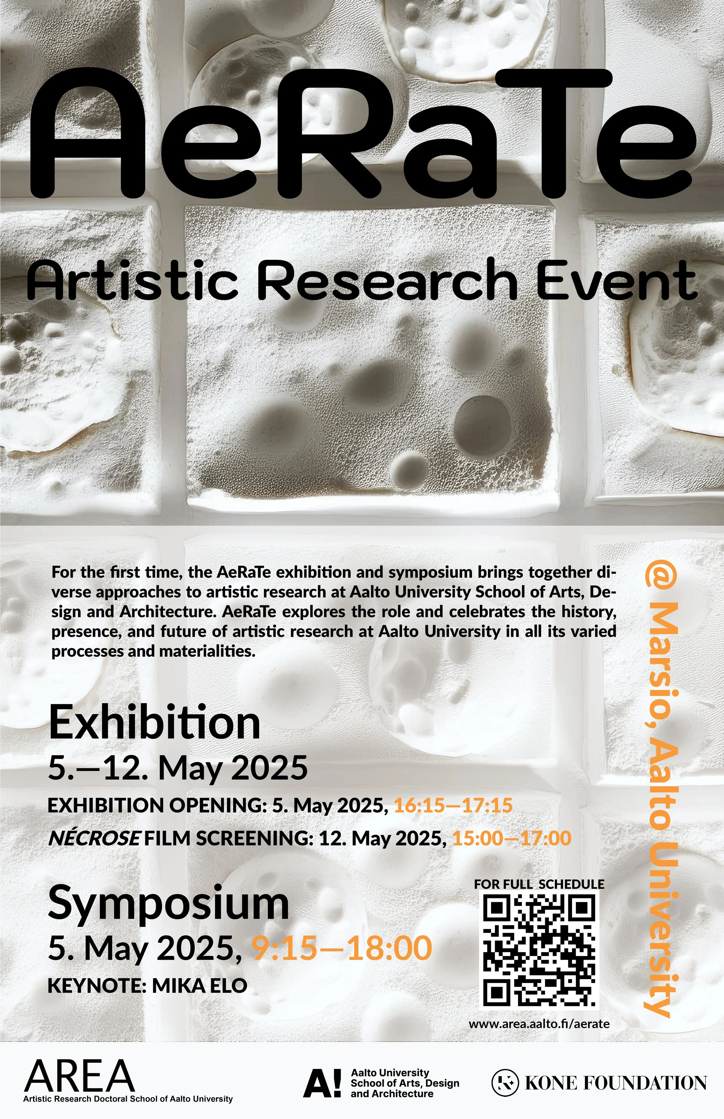 The AREA artistic research doctoral school of Aalto University is pleased to present its inaugural event, AeRaTe, an exhibition and symposium that brings together diverse approaches to artistic research at Aalto University School of Arts, Design and Architecture for the first time. AeRaTe explores the role and celebrates the history, presence, and future of artistic research at Aalto University in all its varied processes and materialities.